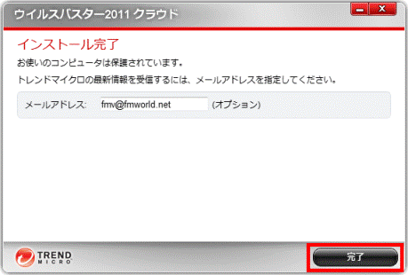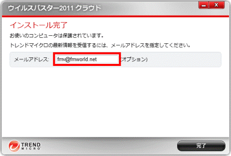 - 「インストール完了」または「メールアドレスを指定してください」と表示されます。