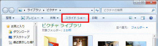 「自動再生」が表示されたら、「×」ボタンをクリックします。Windows フォトビューアーを使用するときは、写真が保存されているフォルダーの「スライドショー」ボタンをクリックします。
