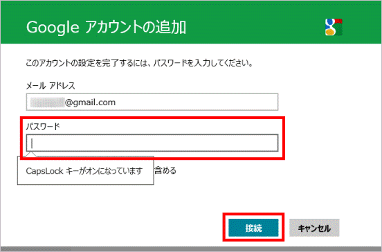 IMAPメールのパスワードを入力し、「接続」ボタンをクリックします。