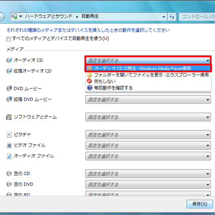 次の手順で、音楽CDと動画のDVDをセットしたときにだけ、自動再生が実行されるように設定を変更します。