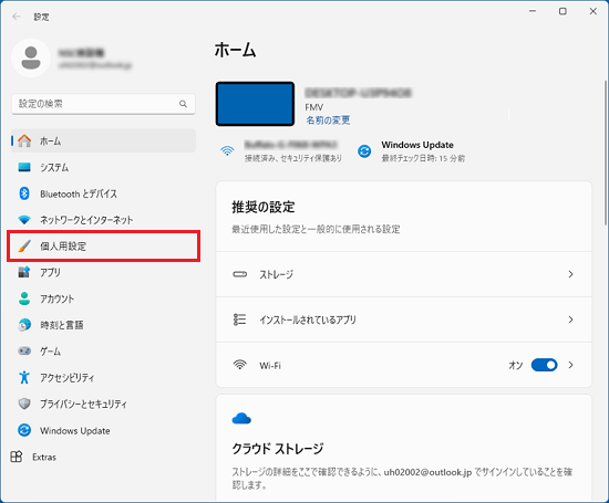 アドバイス「個人用設定」が表示されていない場合は、「設定」の左にある「