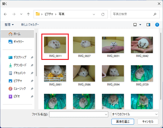 画像が保存されているフォルダーを選択し、背景に設定したい画像をダブルクリックします。