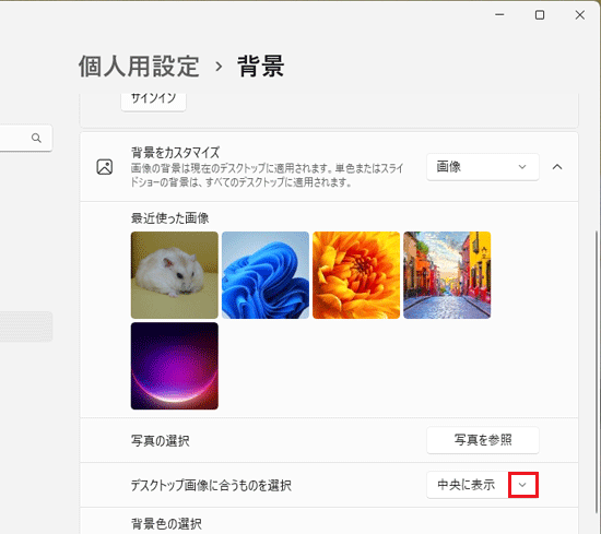 アドバイス- 「背景をカスタマイズ」に「写真を参照」ボタンが表示されない場合は、「背景をカスタマイズ」または右側の「下向き矢印」をクリックして表示を展開してください。