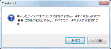 Roxio Creator LJ を使ってディスクにデータを書き込むときに、「挿入したディスクはブランクではありません。今すぐ消去しますか?」と表示される場合は、すでに書き込まれたデータがディスクにあります。