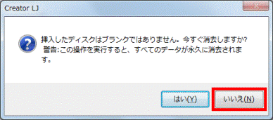- 「挿入したディスクはブランクではありません。今すぐ消去しますか?」の「いいえ」ボタンをクリックします。