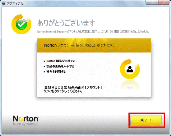 - 「アクティブ化の完了」と表示されたら、「Nortonアカウントを設定する」に進みます。