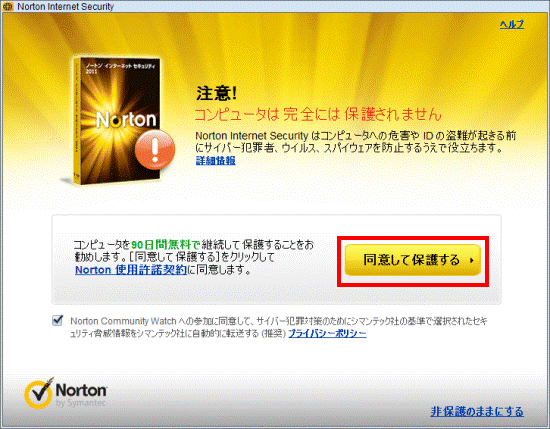 「Norton使用許諾契約」に同意する場合は、「同意して保護する」ボタンをクリックします。