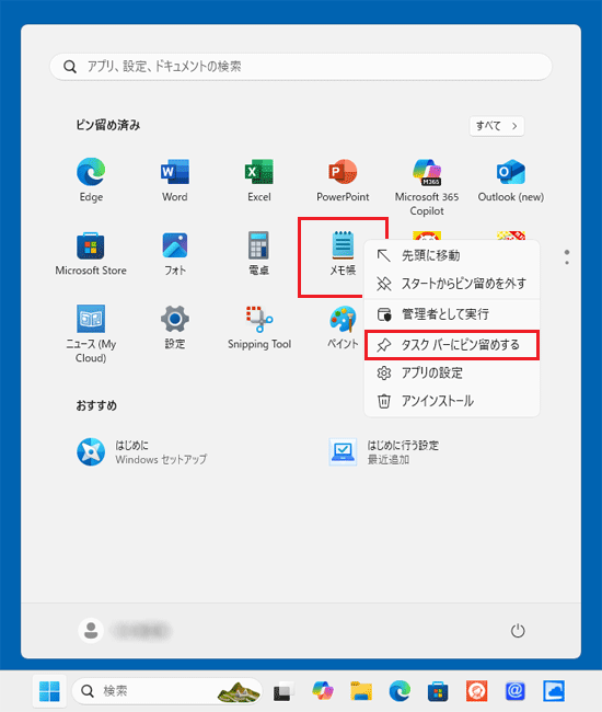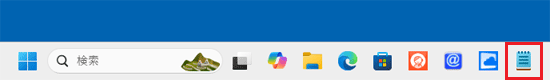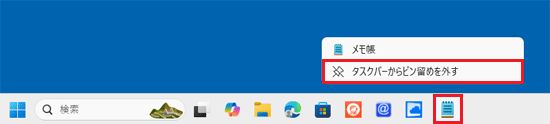 (「メモ帳」をタスクバーにピン留めする場合の例)アドバイス - タスクバーに、アプリがピン留めされたことを確認します。