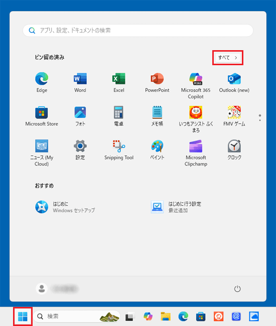 - 「スタート」ボタン→右上の「すべて」の順にクリックします。