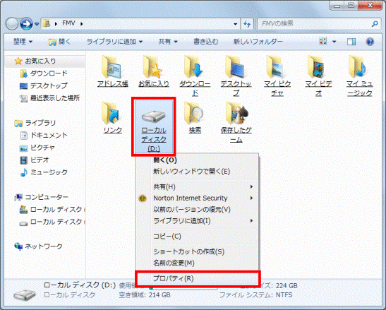 「ローカルディスク(D:)」を右クリックし、表示されるメニューから、「プロパティ」をクリックします。