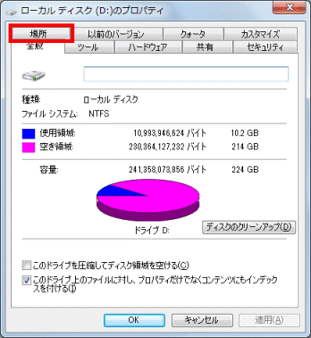 個人用フォルダーに「ローカルディスク(C:)」と表示されている場合は、「ローカルディスク(D:)」の部分を、「ローカルディスク(C:)」に読み替えてください。 - 「ローカルディスク(D:)のプロパティ」が表示されます。