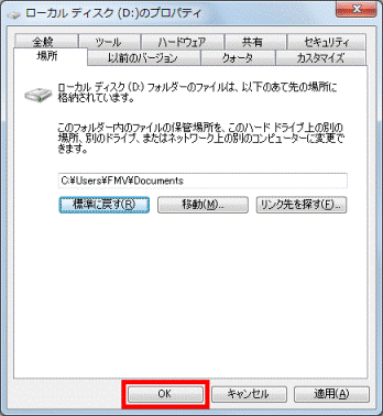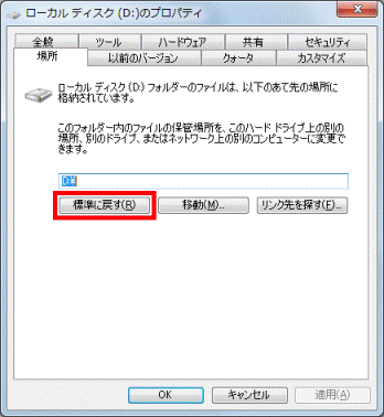 個人用フォルダーの「マイドキュメント」や「マイピクチャ」などのリンク先を、「ローカルディスク(D:)」(または「ローカルディスク(C:)」)に変更した場合に、この現象が発生します。