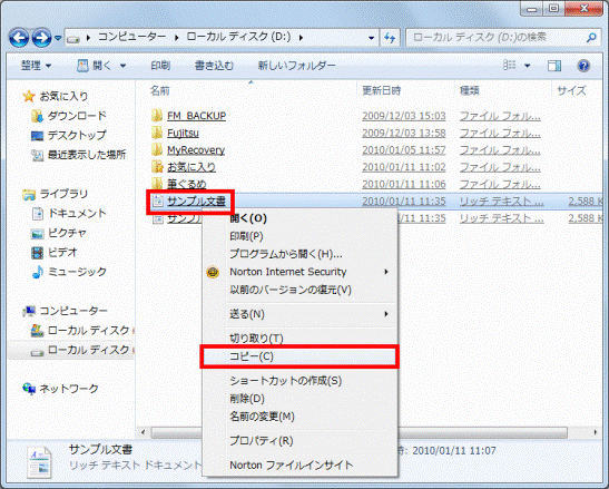 リンク先が、「ローカルディスク(C:)」だった場合は、「ローカルディスク(D:)」を「ローカルディスク(C:)」に読み替えてください。 - 「マイドキュメント」にコピーするファイル(または、フォルダー)を右クリックし、表示されるメニューから、「コピー」をクリックします。