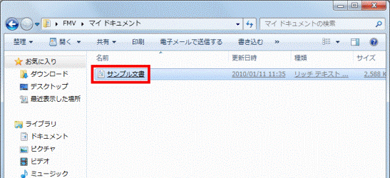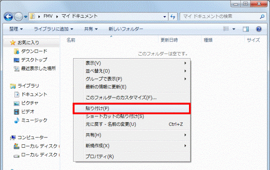 - 「マイドキュメント」内の何もないところを右クリックし、表示されるメニューから、「貼り付け」をクリックします。