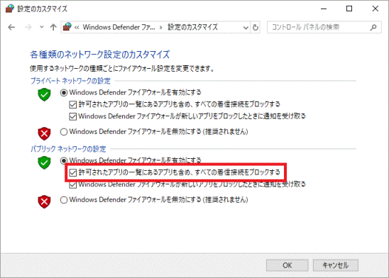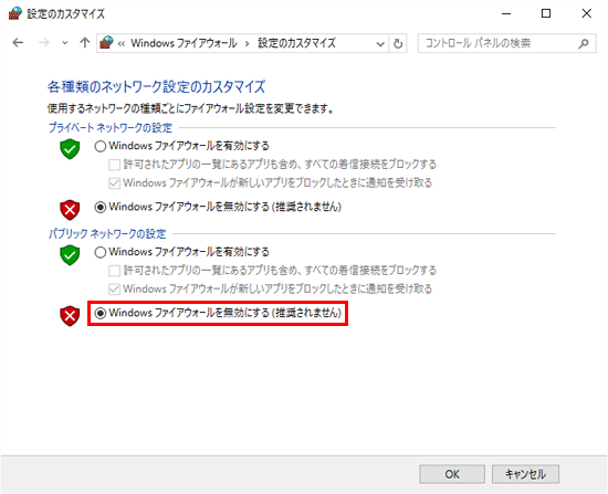 - 「パブリックネットワークの設定」の「Windows Defender ファイアウォールを無効にする」をクリックします。