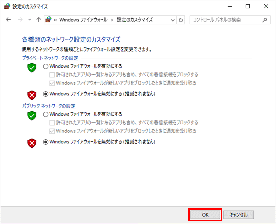次の手順で、Windows Defender ファイアウォールを無効にします。
