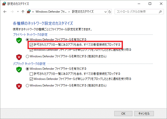 Windows Defender ファイアウォールを無効にすると、パソコンやネットワークが、ハッカーや悪意のあるソフトウェア(ワームなど)の攻撃を受けやすくなります。