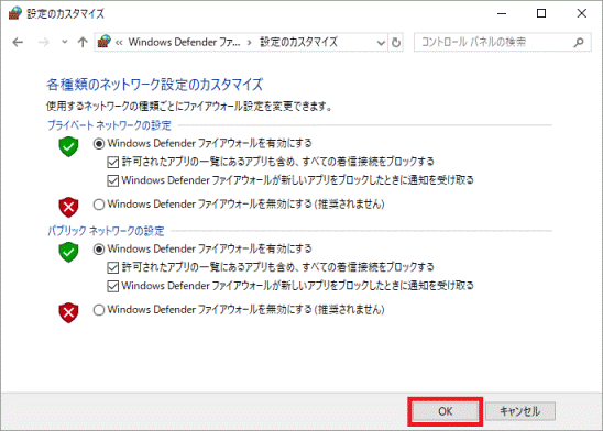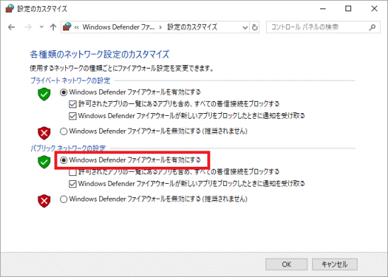 次の手順で、Windows Defender ファイアウォールを有効にします。