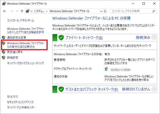 その場合、手順内の「Windows Defender ファイアウォール」は「Windows ファイアウォール」に読み替えてご覧ください。 - セキュリティ対策ソフトのファイアウォール機能が有効な場合は、Windows Defender ファイアウォールを有効にする必要はありません。