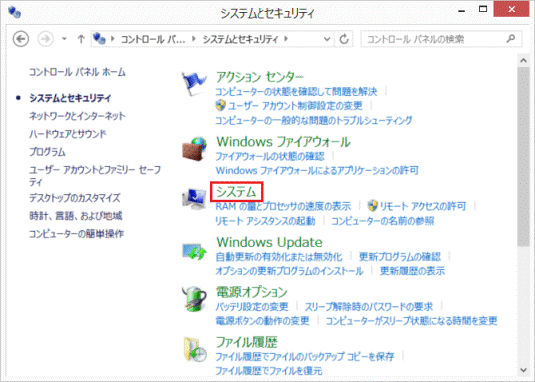 「システムとセキュリティ」が表示されていない場合は、「システム」をクリックして、手順7.に進みます。 - 「システム」をクリックします。