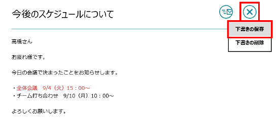 - メール作成中の画面で「閉じる」をクリックまたはタップして「下書きの保存」を選択します。