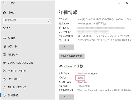 (Windows 10 2022 Update(Windows 10, version 22H2)がインストールされている場合)