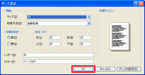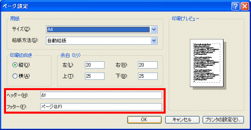 既定の状態では、ヘッダーに「&f」、フッターに「ページ(&p)」が設定されています。