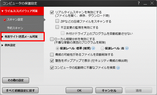左側の一覧から、「有害サイト/迷惑メール対策」をクリックします。