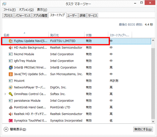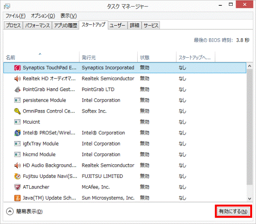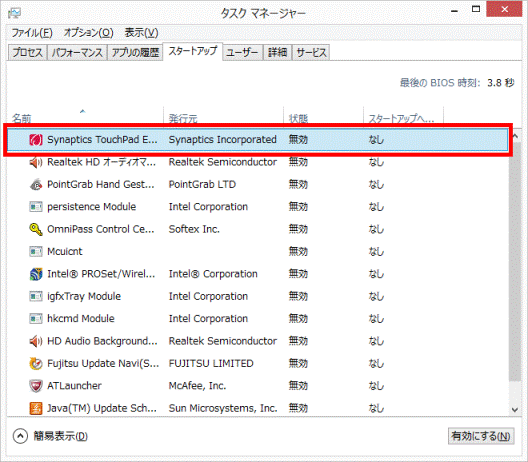 スタートアップの項目をクリックします。アドバイス控えていたメモを元に、はじめから「状態」の欄が「無効」だった項目名をクリックしないように注意します。