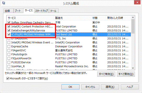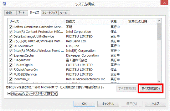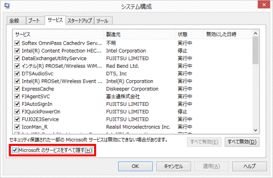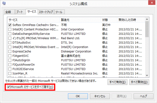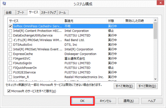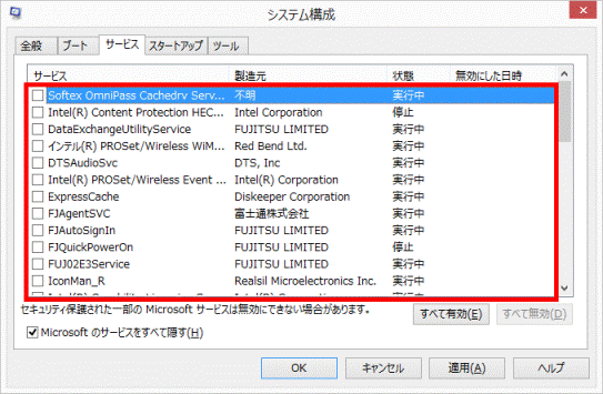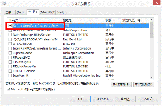 「Softex OmniPass Cachedrv Service」と、他の項目を間違えないように注意してください。 - 「FJAutoSignIn」のチェックを外すと、自動サインイン設定が使用できなくなります。
