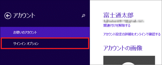 PC設定の変更の「ユーザー」または「アカウント」から、サインインオプションを表示して変更します。