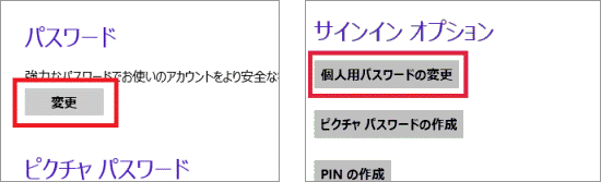 - 「パスワード」の「変更」ボタン、または「サインインオプション」の「個人用パスワードの変更」ボタンをクリックします。