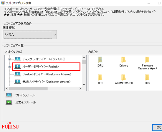 - 「ソフトウェア」欄の「Realtek」、「Audio」、「オーディオ」が含まれる項目をクリックします。