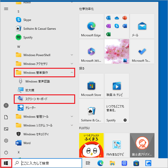「スタート」ボタン→「Windows 簡単操作」→「スクリーンキーボード」の順にクリックします。