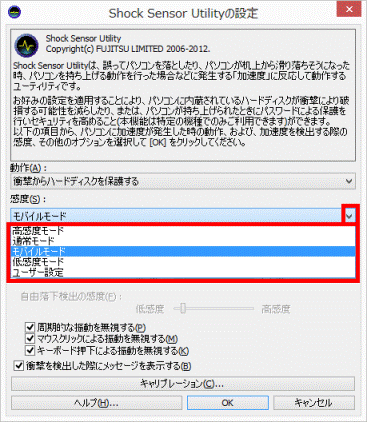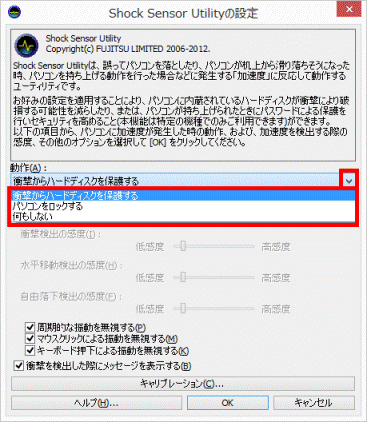 」ボタンまたは「▼」ボタンをクリックし、表示される一覧から、パソコンに生じた加速度を検出するときの感度をクリックします。