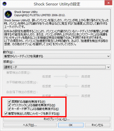 - Shock Sensor Utility は、パソコンに搭載されたハードディスクの保護やセキュリティを完全に保証するものではありません。