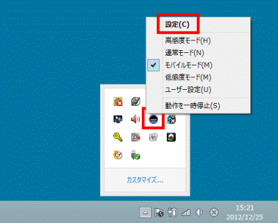 「Shock Sensor Utility」アイコンを右クリックし、表示されるメニューから「設定」をクリックします。