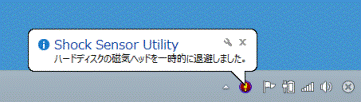 メッセージを表示する設定の場合、磁気ヘッドが退避すると、「ハードディスクの磁気ヘッドを一時的に退避しました。」と、画面右下の通知領域に表示されます。