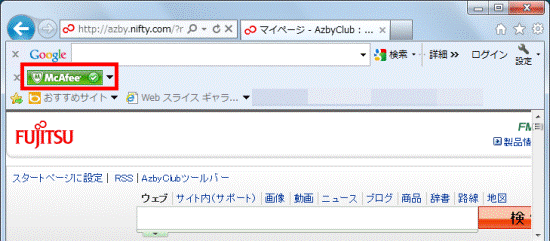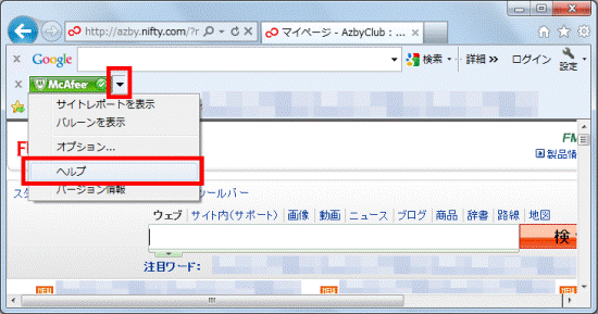 - 「McAfee SiteAdvisor Toolbar」の「▼」をクリックし、表示されるメニューから「ヘルプ」をクリックします。