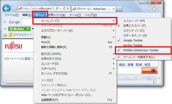 - 「表示」メニュー→「ツールバー」→「McAfee SiteAdvisor Toolbar」の順にクリックし、チェックを外します。