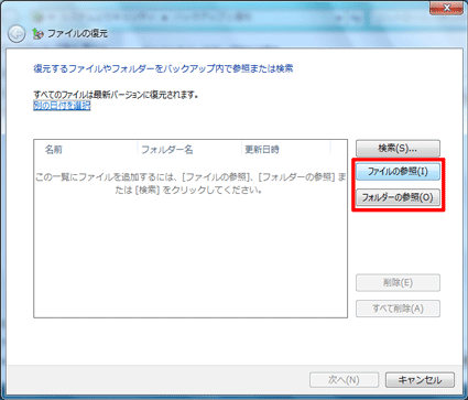 「ファイルの参照」ボタンをクリックします。 - フォルダーを復元する場合