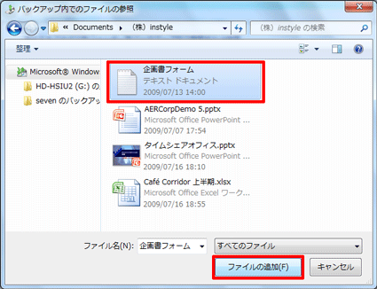 - 復元したいファイル(または、フォルダー)をクリックし、「ファイルの追加」ボタン(または、「フォルダーの追加」ボタン)をクリックします。