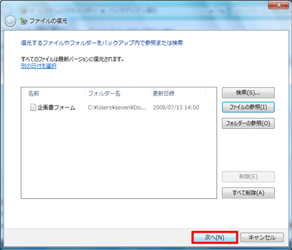 複数のファイル(または、フォルダー)を復元する場合は、手順3.〜手順4.の作業を繰り返し、復元したいデータをすべて選択します。 - 「次へ」ボタンをクリックします。