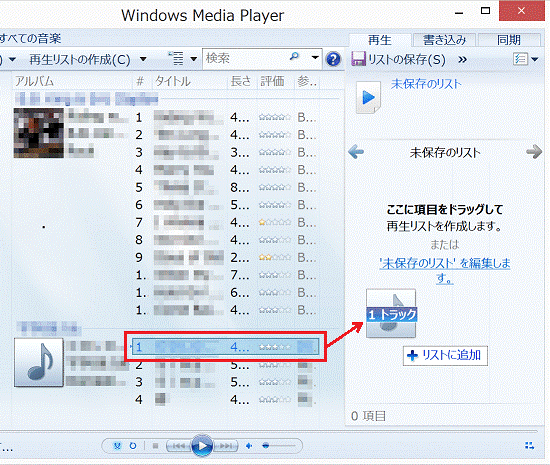 - 再生リストに追加したい曲をクリックしたまま、「未保存のリスト」の欄にマウスポインターを動かし、マウスのボタンから指を離します。