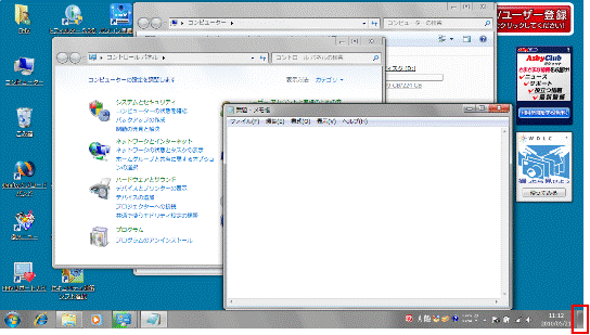 - 画面下のタスクバーの右端にある、「デスクトップの表示」ボタンをクリックします。