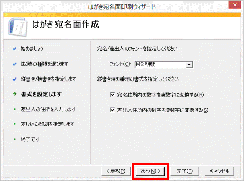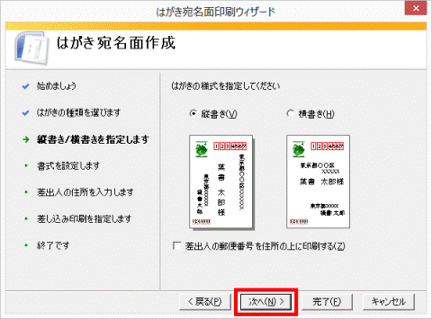 必要に応じて、「差出人の郵便番号を住所の上に印刷する」をクリックしてチェックを付けます。 - 様式を選択したら、「次へ」ボタンをクリックします。