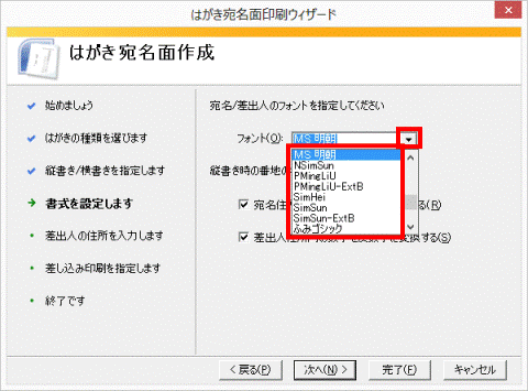 「フォント」の「▼」ボタンをクリックし、表示されるメニューから、宛名および差出人の印刷に使用したいフォント(字体)をお好みでクリックします。