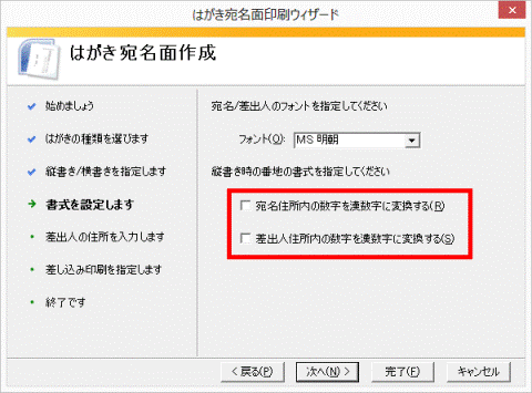 縦書きを選択した場合は、お好みで「縦書き時の番地の書式を指定してください」にある項目をクリックしチェックを付け外しして、漢数字を使用するかどうかを指定します。