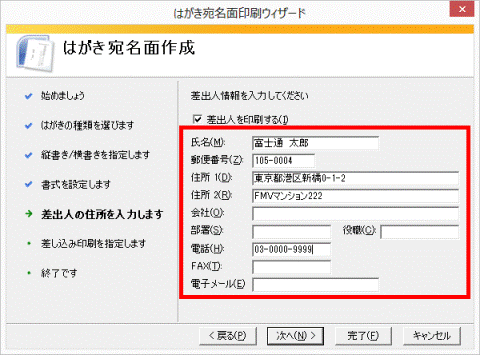 はがきの宛名面側に差出人を印刷したくない場合は、「差出人を印刷する」のチェックを外します。 - 差出人情報(氏名、郵便番号、住所1、電話番号など)を入力します。