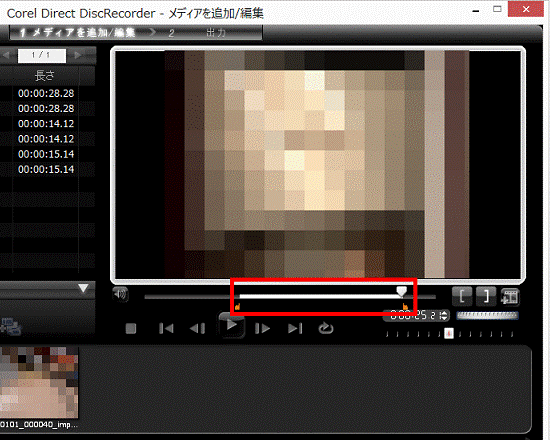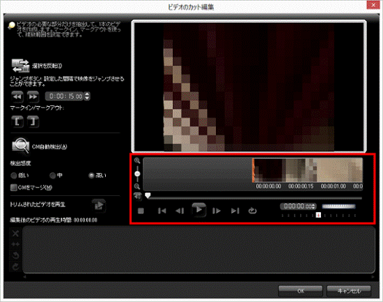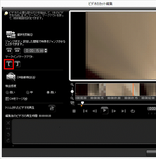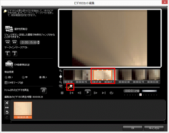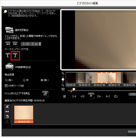 - 「マークイン」から「マークアウト」まで指定した映像が、選択されていることを確認します。